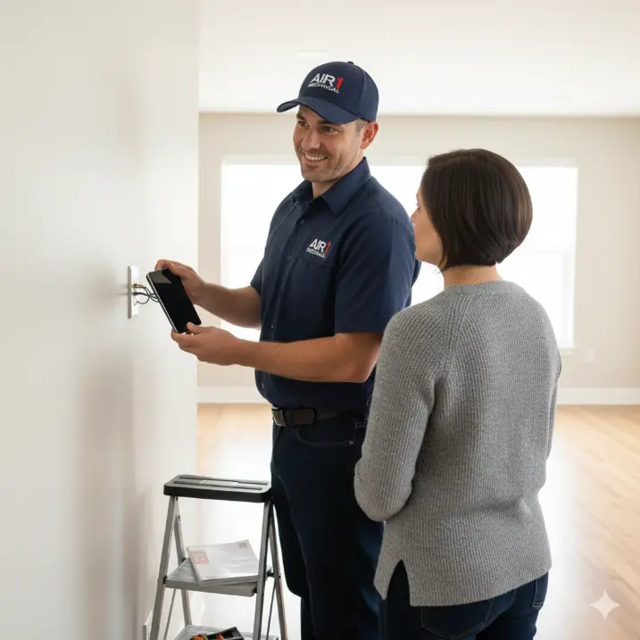 At AirOne360, our licensed electricians provide professional smart thermostat installation, wiring, and setup services to ensure seamless integration with your HVAC system. We handle everything — from selecting the right device to configuring schedules and connecting it to your Wi-Fi and smart-home ecosystem.